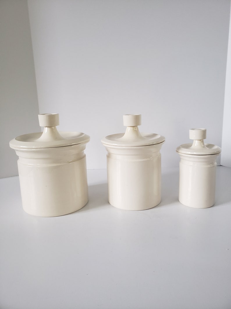 Vintage set of 3 ceramic canisters pfaltzgraff for avon country village farm. German lusterware kitchen canister set and cruet set, 6 piece white block pearl white porcelain meta. Vintage spring rose and butterfly 3 piece kitchen canister set august grove. American atelier bianca scroll white canisters (set of 3) (bianca scroll white set of 3 canisters). Vintage set of 3 italian post modern memphis style marble canisters attrib. Set of 3 vintage old home tin nesting kitchen canisters from d.h. Vintage 1970s set of 3 metal canisters. Product titlebloomingville set of 3 white stoneware canisters wit. Set of 3 ivory chalkboard rooster canisters gb by home essentials | ebay. Sugar, flour, oatmeal, coffee & tea and 4 small canisters: Farmhouse kitchen canister sets and farmhouse decor ideas easy diy. Vintage pink canisters kitchen canister set kitchen | etsy. Set of 3 trisha yearwood white canisters w/ embossed bird wood lids food safe.